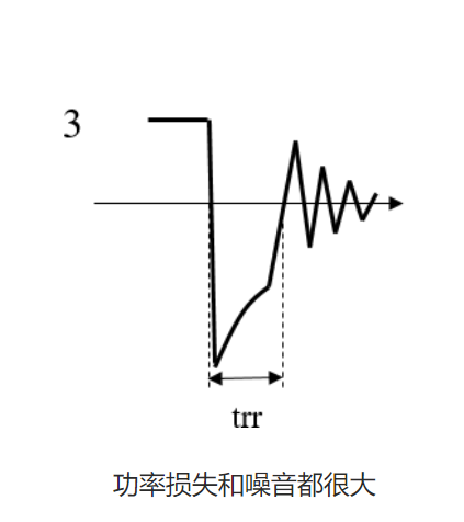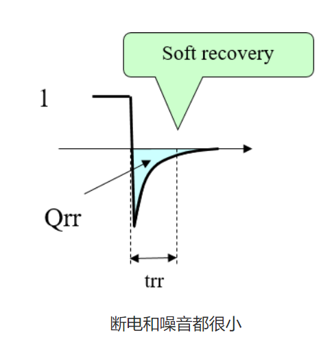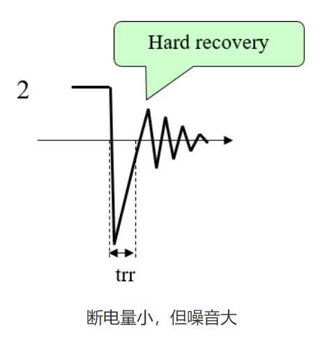 恢复电流恢复太突然时,它会产生更多的噪音. 因此,trr 不仅要小,而且需要较缓的恢复. 下面数字1和3在规格中可能看起来具有相同的 trr,但损耗和噪音都大不相同. 此外,2号在查看规格时看起来非常好,但它会产生很大的噪音.