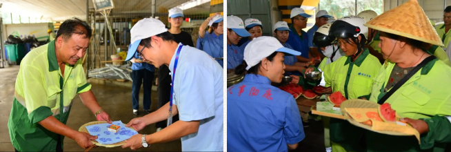 家人们早早准备好,在大家长吴董、章总监的带领下,准时向环卫工人临时集结点出发,为叔叔阿姨们送上一份心意,一份夏日清凉!