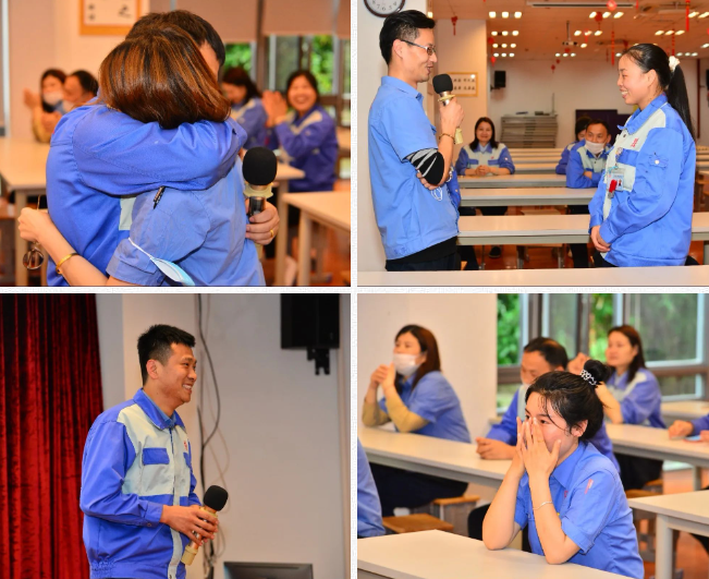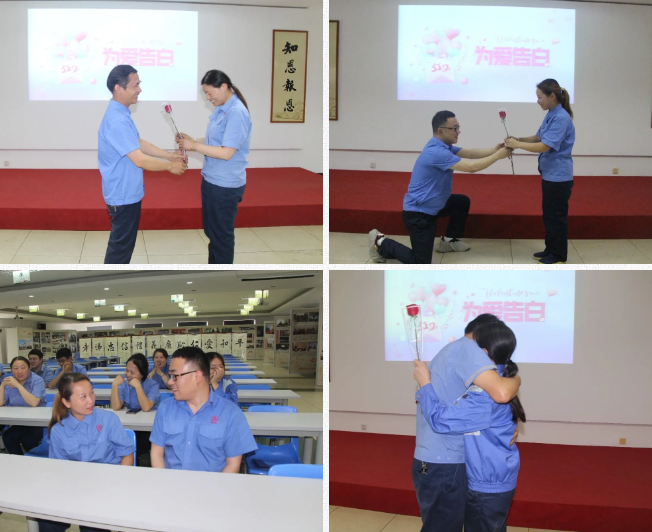 丈夫们不会什么甜言蜜语,面对妻子们的表白,他们选择用拥抱诠释一切。简单的一句“太太,我爱你”包含了心中最为深沉真挚的爱。有的爱意或许从未被宣之于口,但是它一直都在。忠恳支部的鲁小亮也向妻子张红倩深情告白,他单膝下跪,引发了现场热烈的气氛。