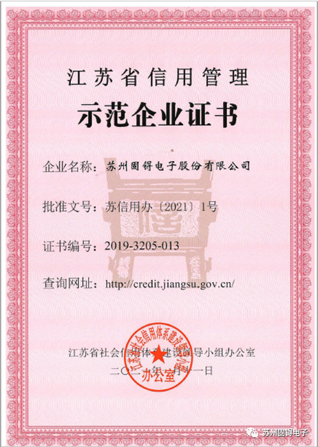 苏州固锝荣获江苏省信用管理示范企业