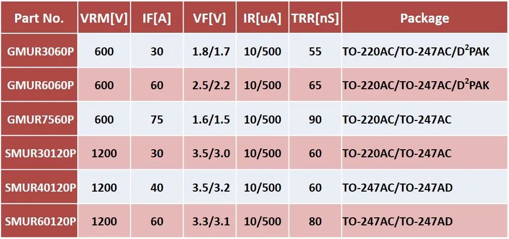 苏州固锝电子600V,1200V快恢复功率二极管产品系列,可以提供4种不同的产品封装(TO-220AC、D2PAK、TO-247AC, TO-247AD ),优化反向恢复时间,提升高温反向漏电特性,以达到优越的开关损耗以及直流损耗,提高了电动汽车、混合动力汽车、通信、工业和商用等电源类产品的使用效率。