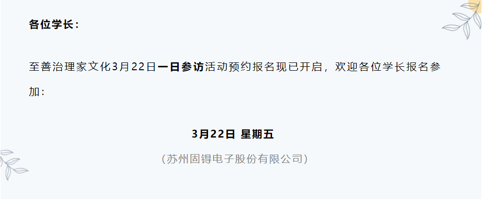 3月22日,期待您和我们一起走进苏州固锝,感受幸福企业家文化的蓬勃生气,学习企业发展的心法与技法,体悟基业长青与文化传承的力量源泉。