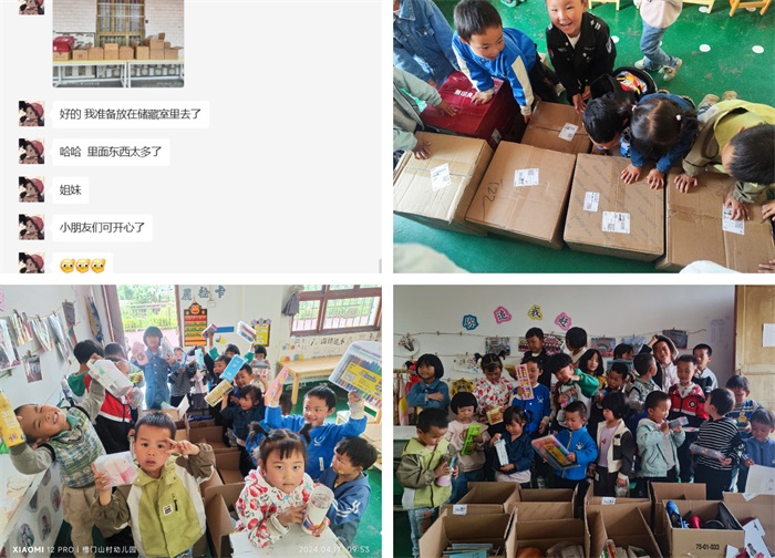 在当地学校和相关机构的协助下,4月17日上午,贵州槽门山村幼儿园收到捐赠物品。小朋友们看到一个个纸箱,眼中闪烁着好奇与期待,围在老师身边,等待“开箱”。一盒盒彩笔,一个个本子,通过老师,传递到孩子们手中,愿他们能手拿画笔,尽情描绘心中的梦想。