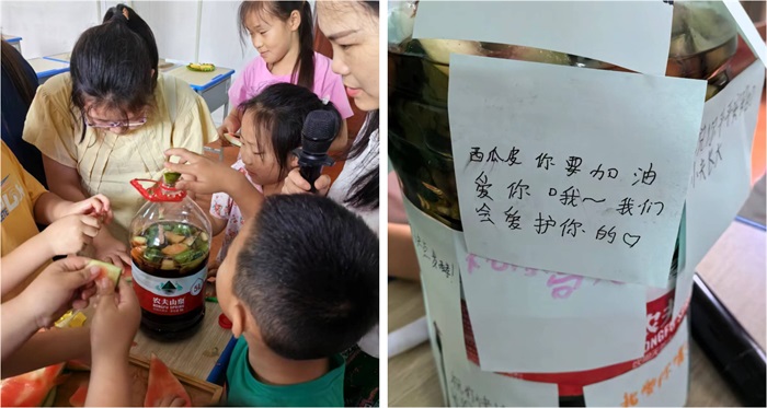 实践课上,老师引导孩子们收集西瓜皮,二次利用制作环保酵素,为地球妈妈减负。按照1:3:10的比例,加入红糖、西瓜皮和水后,宝贝们好奇地观察酵素瓶,期待着未来的变化。