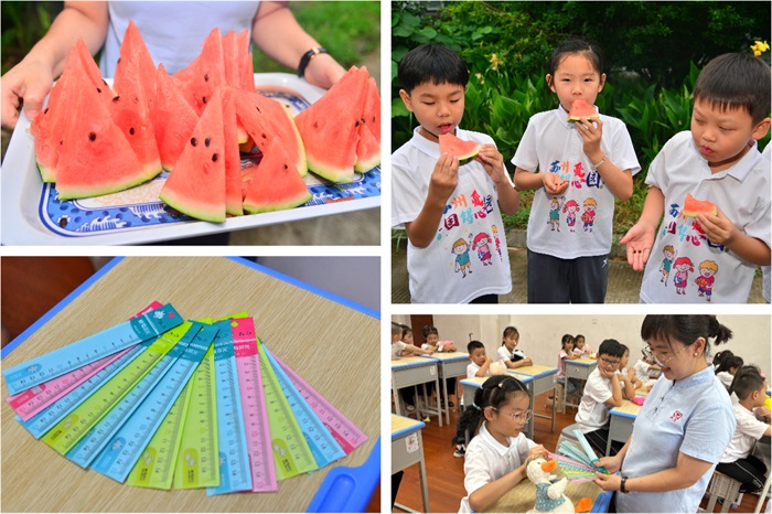 不远处传来的童声,把我们吸引到多姿多彩的手工课现场。孩子们在老师的声声鼓励中,点燃了DIY折扇的热情,不一会儿,一把把带有夏天味道的“西瓜扇”就呈现在大家的眼前。