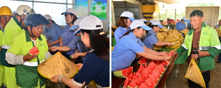 随着环卫工叔叔阿姨们陆续归来,家人们递上香甜的西瓜,清热生津,准备竹编斗笠,遮雨蔽日,用小小的善举,拂去夏日的炎热,用满满的爱意,关怀他们的身心。