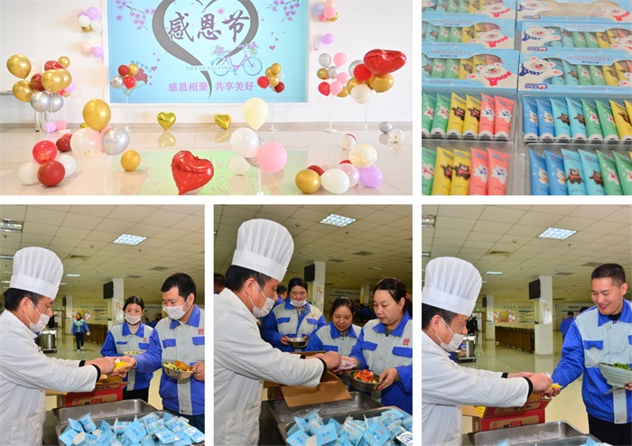 走进公司总部幸福餐厅,就能感受到浓烈的“感恩气息”,五彩的气球,可口的点心,给节日增添别样的活力。