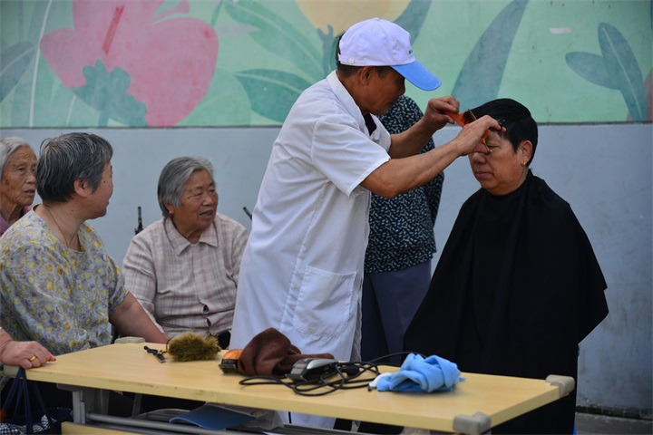 理发区域同样很热闹。理发师手持剪刀和梳子,眼神中透露出专注与自信。他们认真听取居民对发型的要求,用灵巧的双手为他们修剪出满意的发型。一位刚理完发的阿姨满脸笑容地说:“这发型真好看!感谢你们把便民服务送到家门口,为你们点赞!”