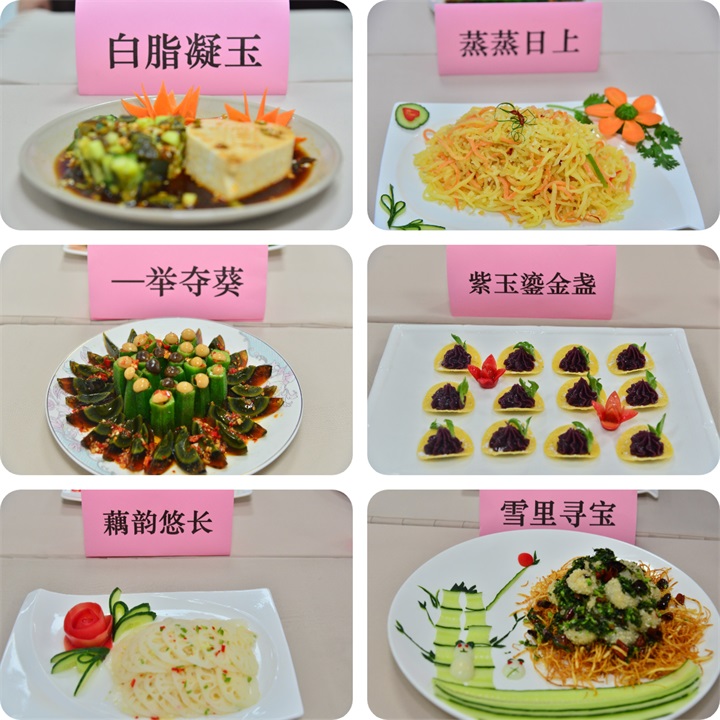 有人用黄瓜、胡萝卜做装饰点缀,有人用秋葵、豆腐、土豆做拼盘。“白脂凝玉”“藕韵悠长”…… 光是这些诗意的菜名,就勾得人想一探究竟。
