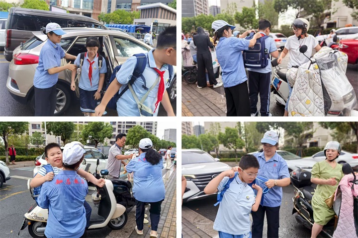 “孩子,别急,慢慢走,注意脚下。”志愿者们一边轻声叮嘱,一边伸手扶住从电瓶车上下来差点被书包绊倒的小朋友。她们主动帮孩子背起书包,微笑着引导车辆、维持秩序,让校门口的晨间交通忙而不乱。