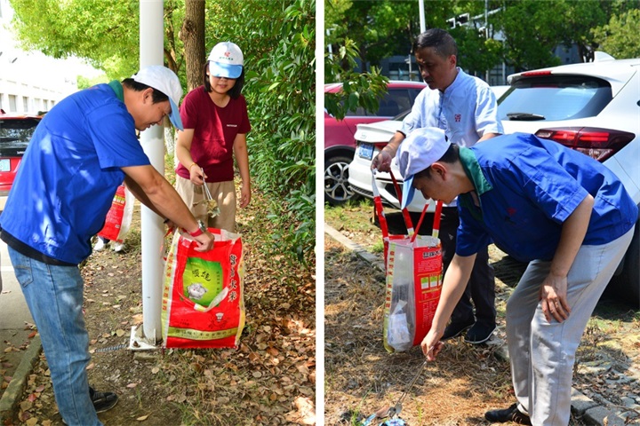 中午,一群身影正穿梭在厂区外的绿植间。他们手执长钳,一次次俯身,像接受一次次精神的洗礼,不放过一个瓶盖、一张废纸。