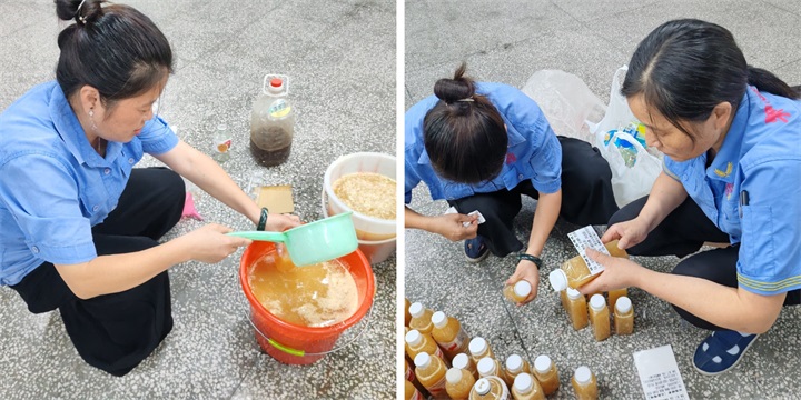 志愿者们将果皮菜叶化作环保酵素,让旧布料变身时尚环保袋。每一次精心的准备,都承载着绿色生活的智慧。